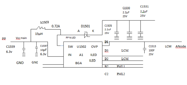 + Dòng đồng hồ vạn năng ở thang đo điện trở, thang Ω x 1, que đỏ để mass, que đen ta đo vào 3 chân 1, 2, H của connec J2019. Chân nào làm kim đồng hồ vạn năng lên là chân đó bị chập. Với pan bệnh này thường là do 3 tụ lọc C1503, C1503, C1531, C1505 bị chập. Khi một trong ba tụ này chập sẽ làm cho ic µ1502 và D1501 và λ1503 bị hỏng thì ta cách ly 3 tụ C1503, C1531, C1505 mà hết chập ta phải thay bằng 3 tụ khác thay thế và thay luôn ic µ1502 và D1501 và λ1503 là mạch đèn đã sáng trở lại: