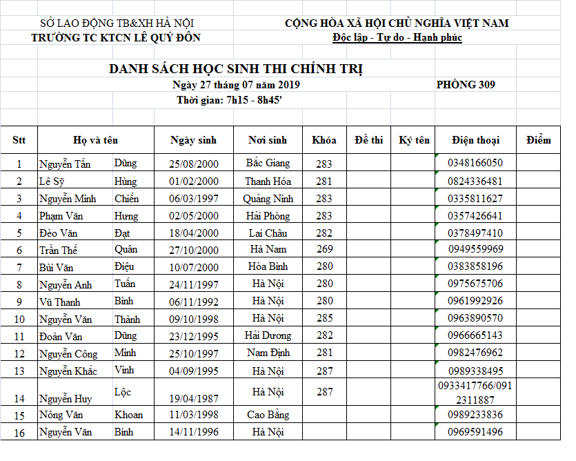 DANH SÁCH HỌC SINH THI TỐT NGHIỆP CHÍNH TRỊ THÁNG 07/2019