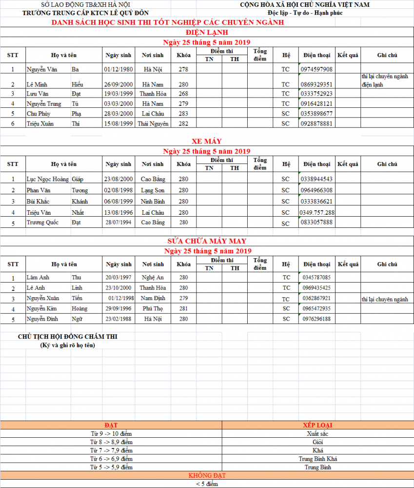 DANH SÁCH HỌC SINH THI TỐT NGHIỆP THÁNG 05/2019 CÁC CHUYÊN NGÀNH