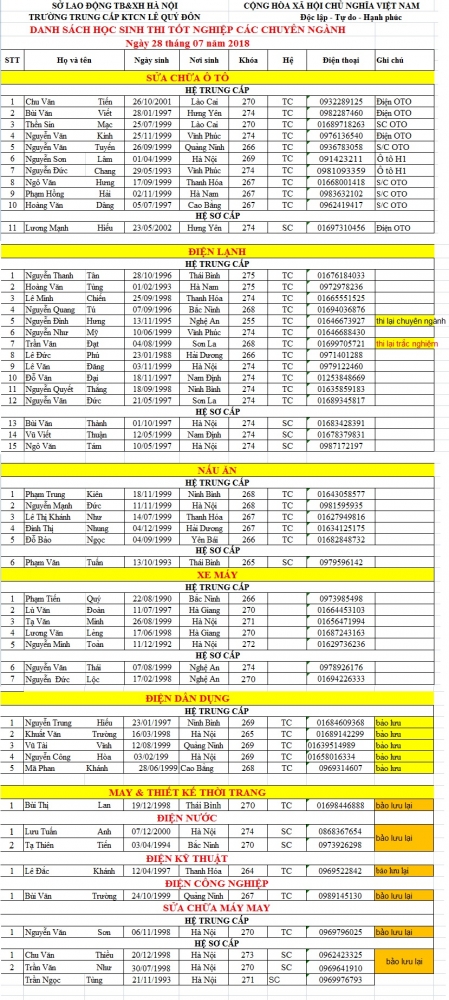 DANH SÁCH HỌC SINH THI TỐT NGHIỆP THÁNG 07/2018 CÁC CHUYÊN NGÀNH