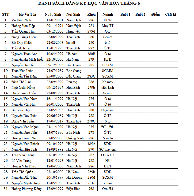 DANH SÁCH LỚP HỌC VĂN HÓA THÁNG 06/2019