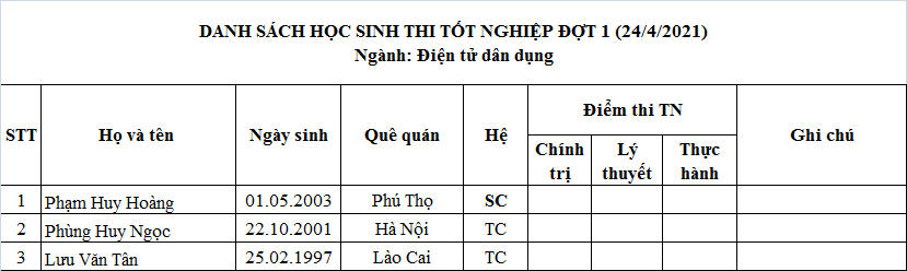 DANH SÁCH THI TÔT NGHIỆP 24/04/2021
