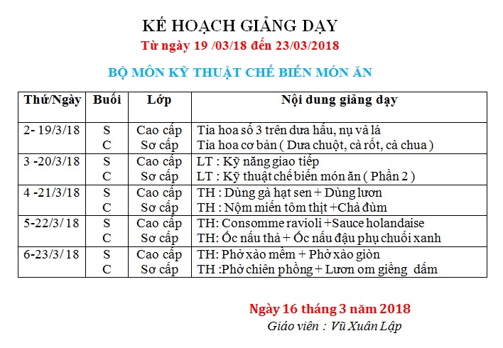 Lịch học chi tiết lớp NẤU ĂN từ 19/03 đến 23/03/2018