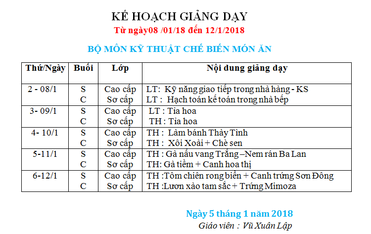 Lịch học chi tiết ngành Kỹ thuật chế biến món ăn từ 08/01 đến 13/01/2018