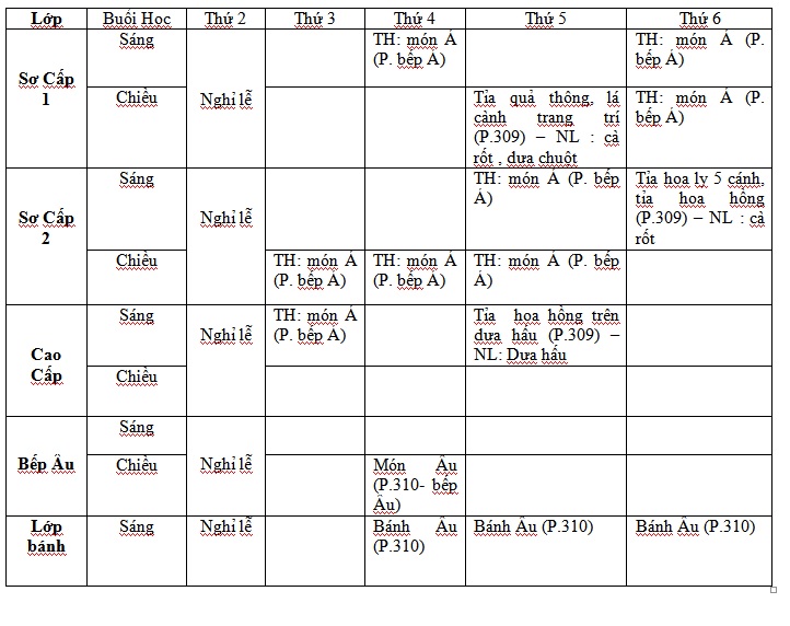 LỊCH HỌC CHI TIẾT NGÀNH NẤU ĂN TỪ 04/09 ĐẾN 07/09/2018