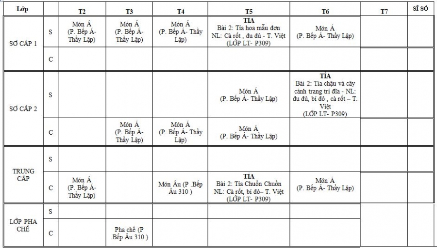 LỊCH HỌC CHI TIẾT NGÀNH NẤU ĂN TỪ 08/10 ĐẾN 12/10/2018