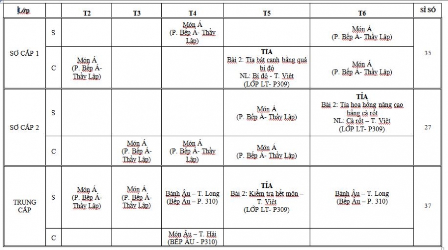 LỊCH HỌC CHI TIẾT NGÀNH NẤU ĂN TỪ 10/09 ĐẾN 14/09/2018