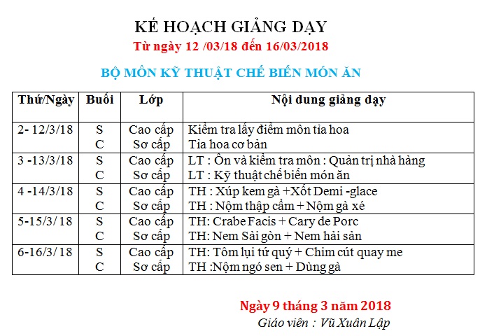 Lịch học chi tiết ngành Nấu Ăn từ 12/03 đến 16/03/2018