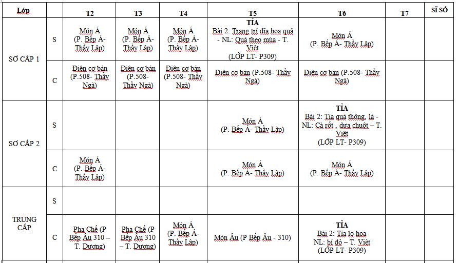 LỊCH HỌC CHI TIẾT NGÀNH NẤU ĂN TỪ 22/10 ĐẾN 26/10/2018