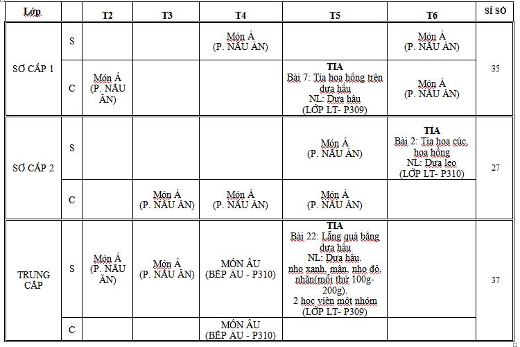 LỊCH HỌC CHI TIẾT NGÀNH NẤU ĂN TỪ 27/08 ĐẾN 31/08/2018