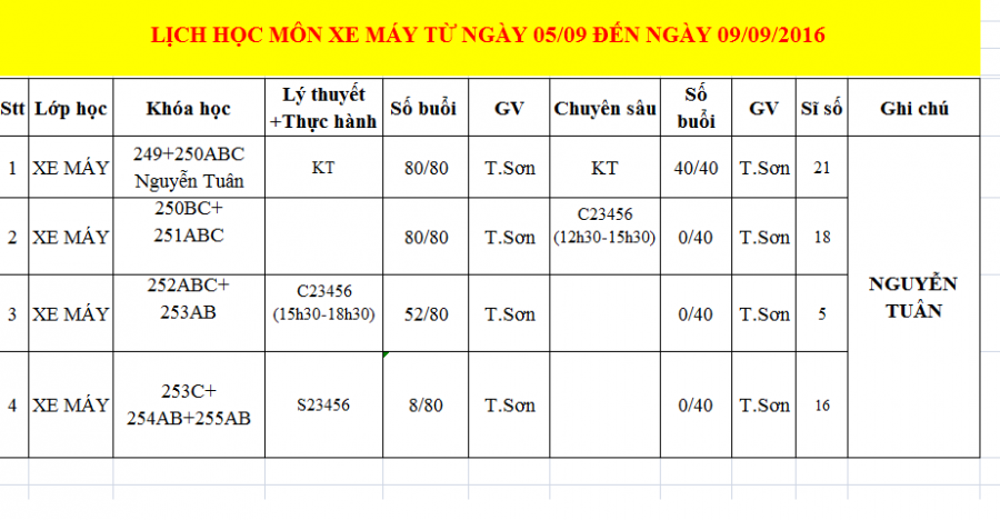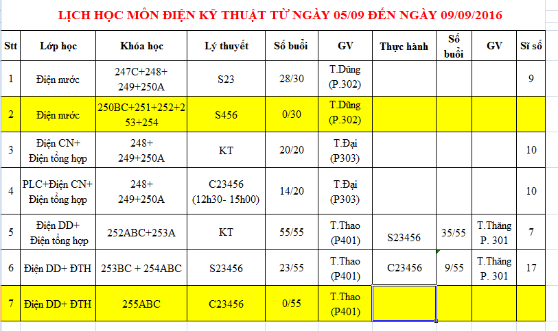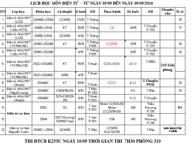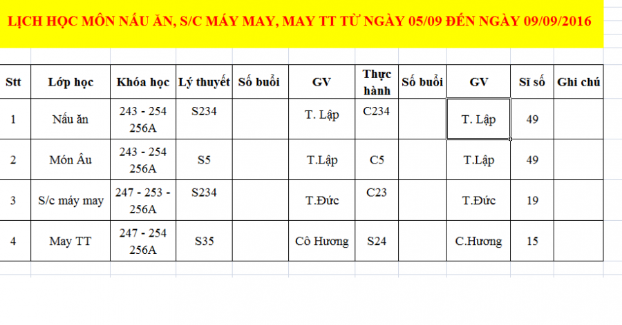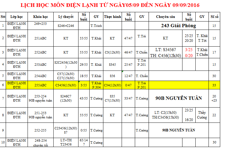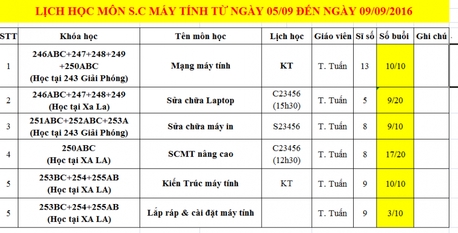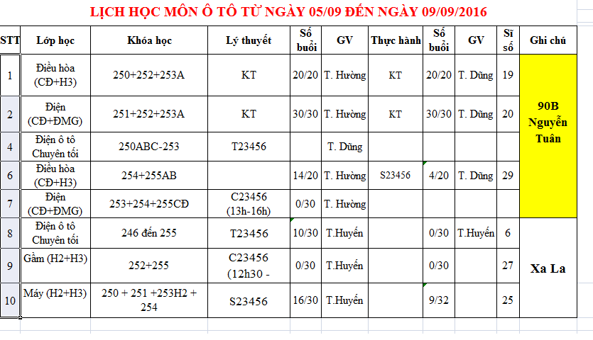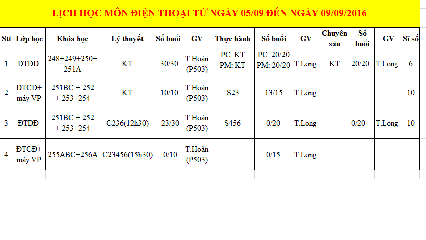 Lịch học từ ngày 05/09 đến hết ngày 09/09/2016