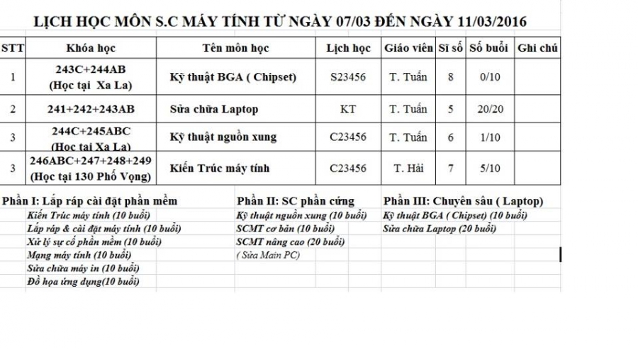 Lịch học tuần từ 07/03 đến 11/03/2016