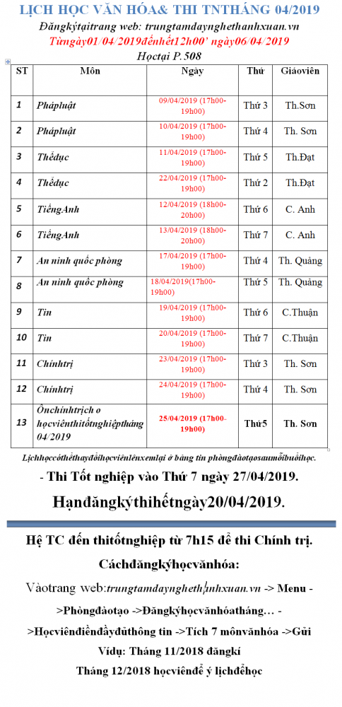 Hạn đăng ký thi TN hết ngày 20/04/2019.
