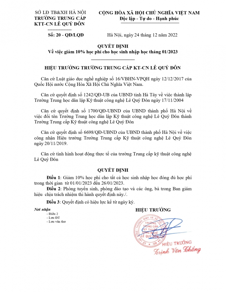 Trường Trung cấp kỹ thuật công nghệ Lê Quý Đôn, Trung tâm giáo dục nghề nghiepẹ Thanh Xuân thông báo : Quyết định giảm 10% học phí cho học sinh nhập học từ 01/01/2023 đến 26/01/2023 đóng học phí đủ