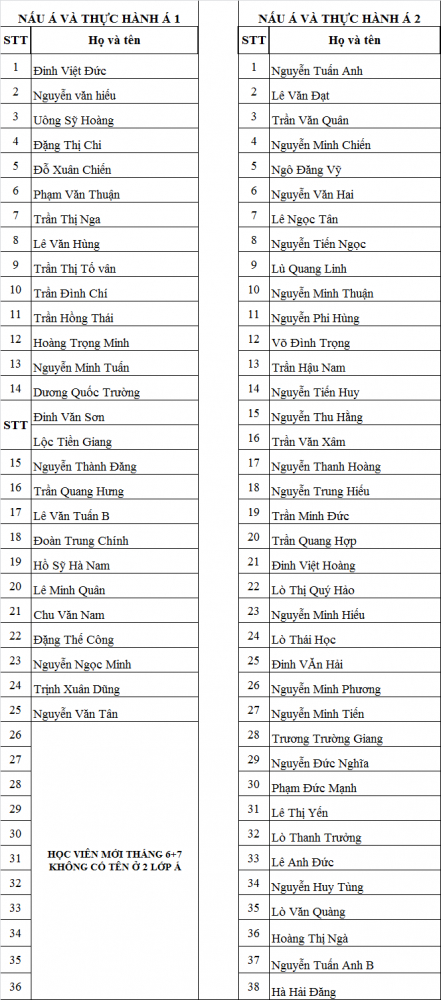 THÔNG BÁO DANH SÁCH LỚP NẤU ĂN Á