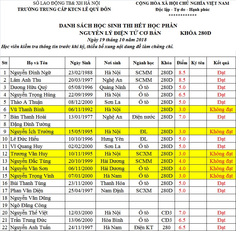 THÔNG BÁO ĐIỂM THI LỚP ĐIỆN TỬ CƠ BẢN KHÓA 280D
