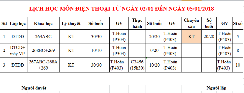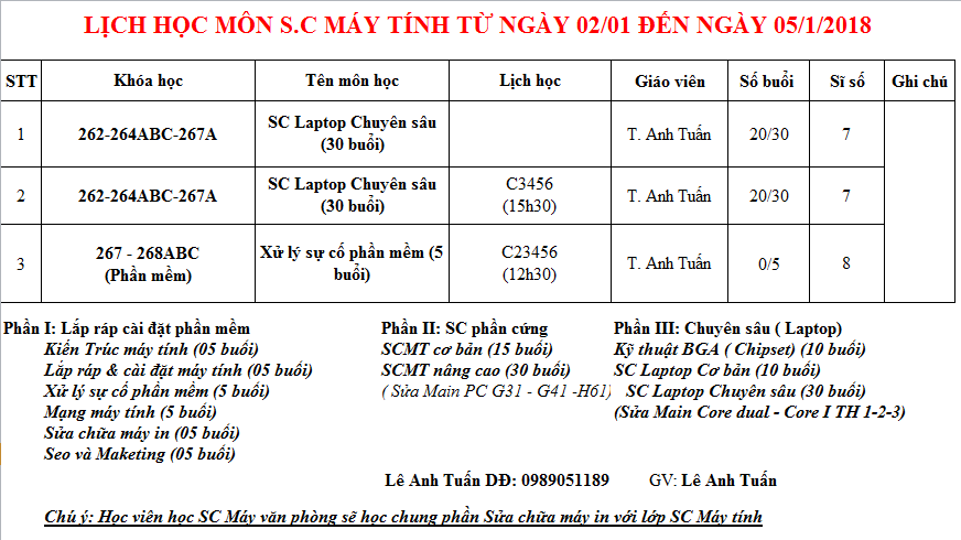 THÔNG BÁO LỊCH HỌC TỪ 02/01/2018 ĐẾN 06/01/2018