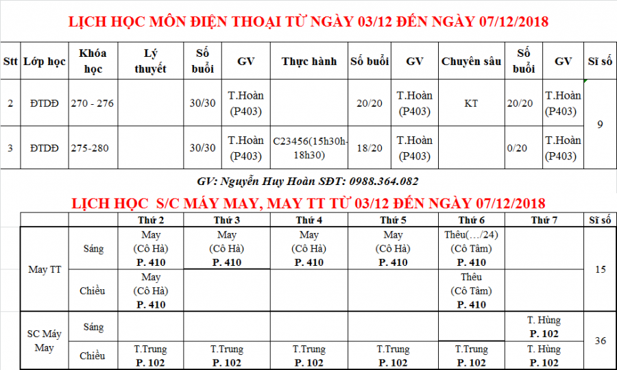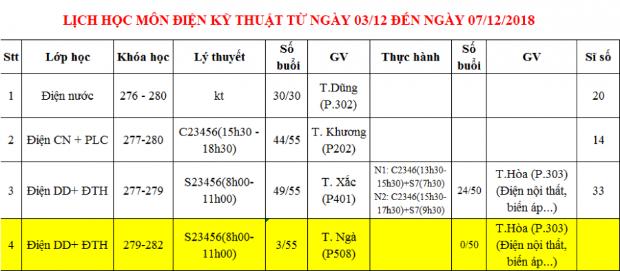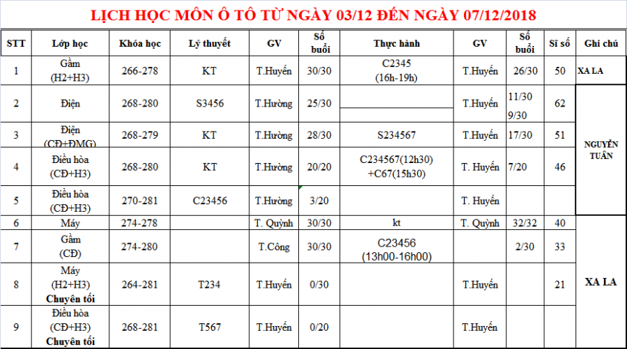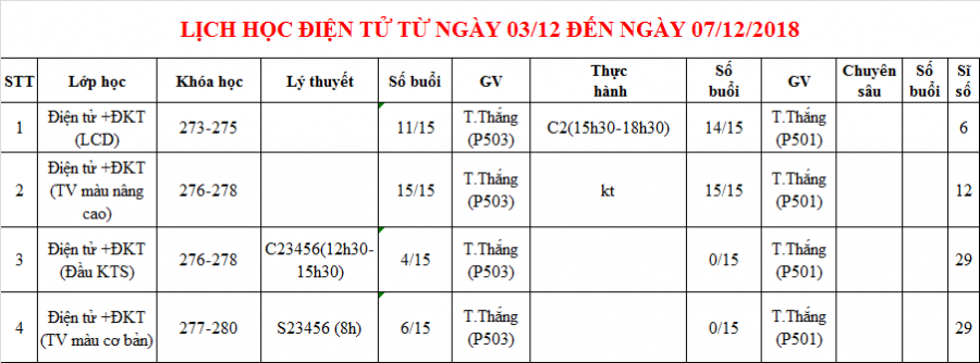 PHÒNG ĐÀO TẠO THÔNG BÁO LỊCH HỌC TỪ 03/12 ĐẾN 07/12/2018