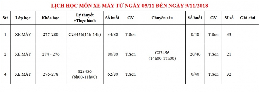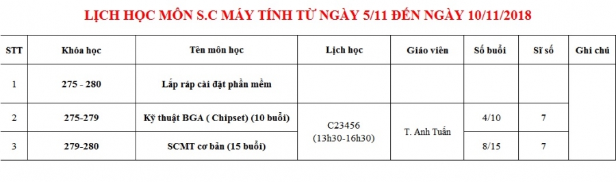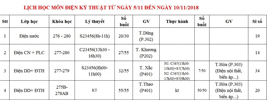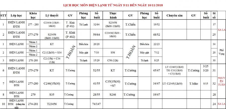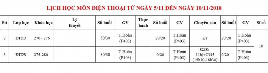 PHÒNG ĐÀO TẠO THÔNG BÁO LỊCH HỌC TỪ 05/11 ĐẾN 09/11/2018