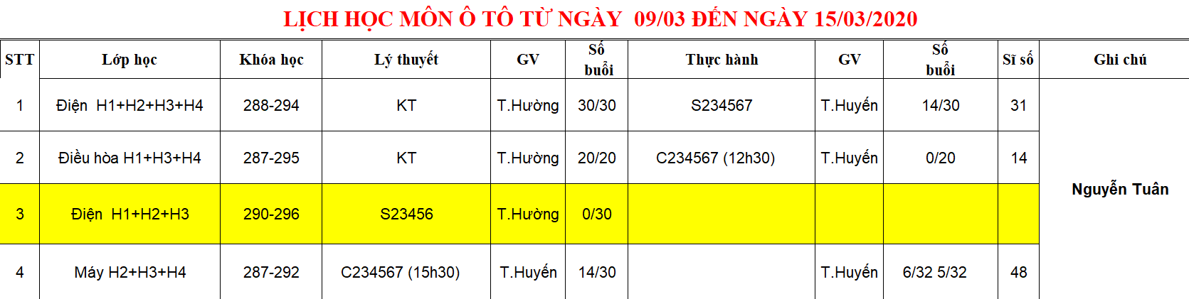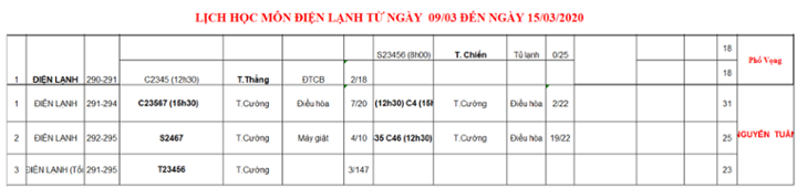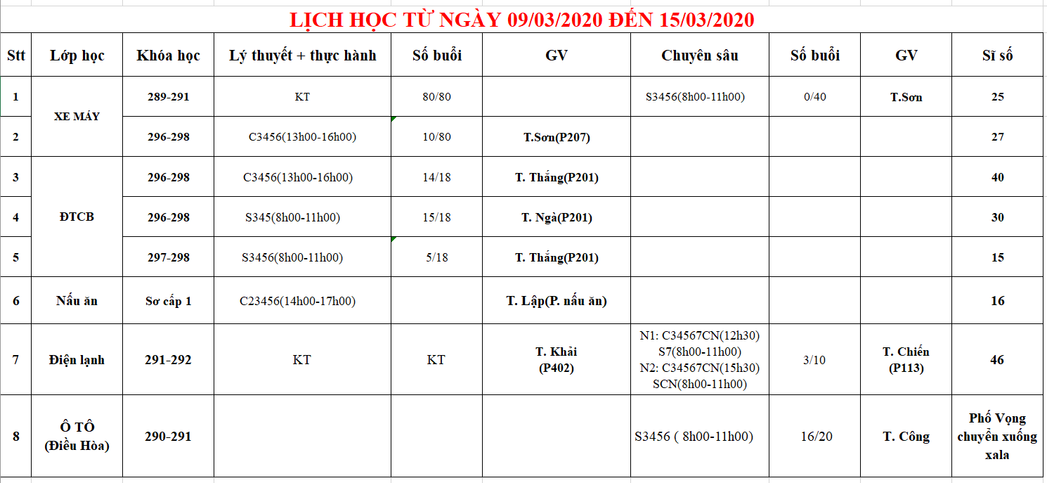Thông báo lịch học từ 09/03 đến 15/03/2020