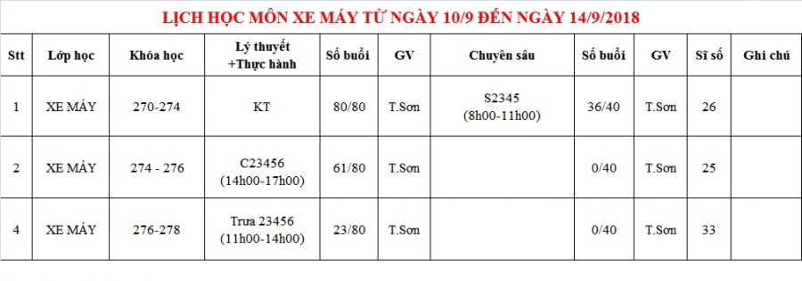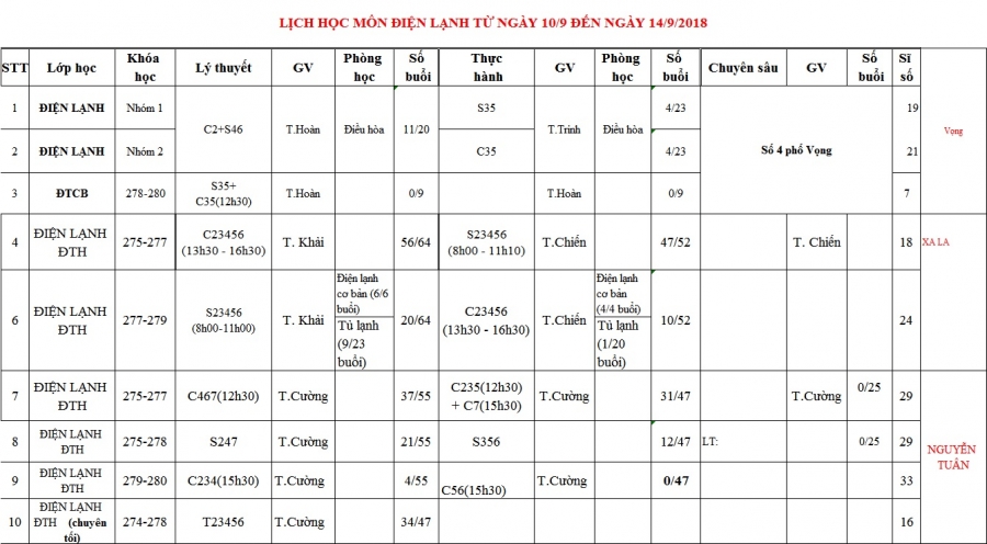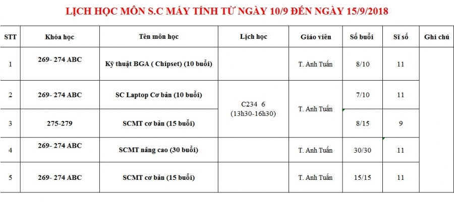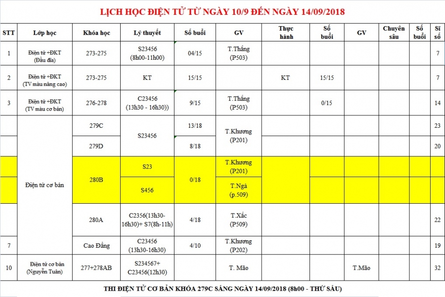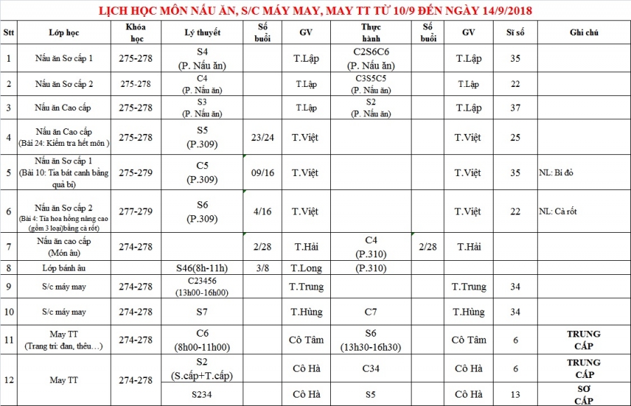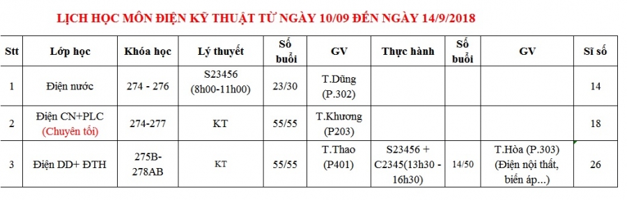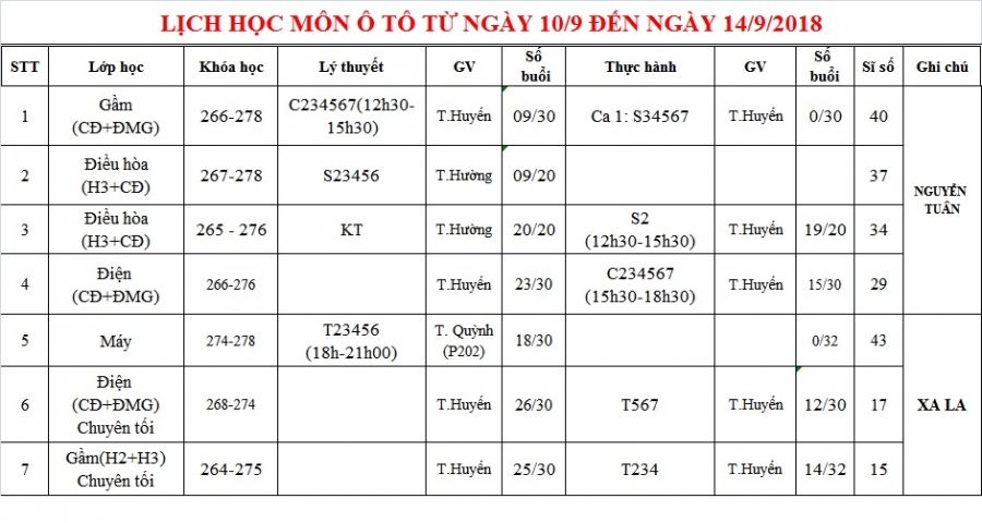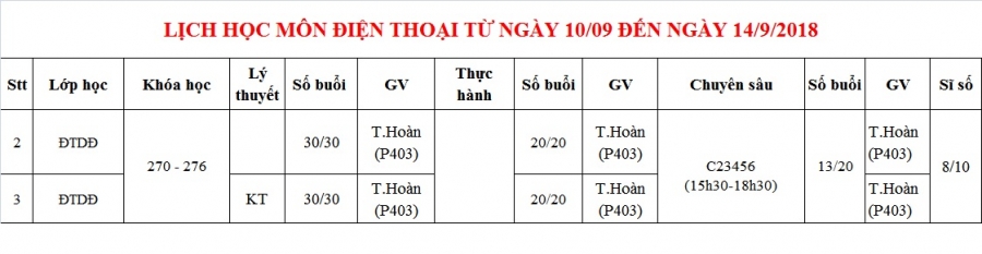 PHÒNG ĐÀO TẠO THÔNG BÁO LỊCH HỌC TỪ 10/09 ĐẾN 14/09/2018
