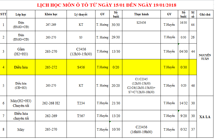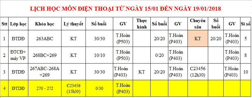 THÔNG BÁO LỊCH HỌC TỪ 15/01/2018 ĐẾN 19/01/2018