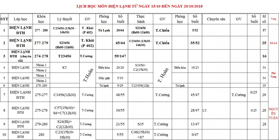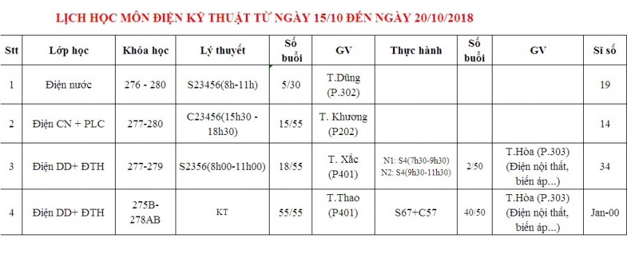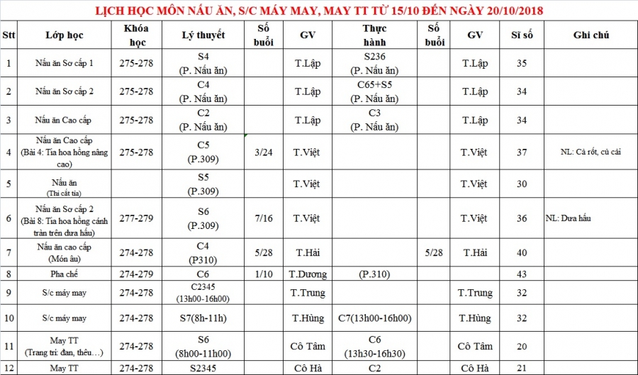 PHÒNG ĐÀO TẠO THÔNG BÁO LỊCH HỌC TỪ 15/10 ĐẾN 20/10/2018