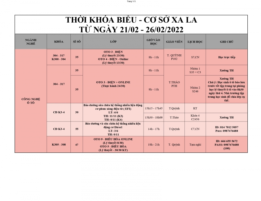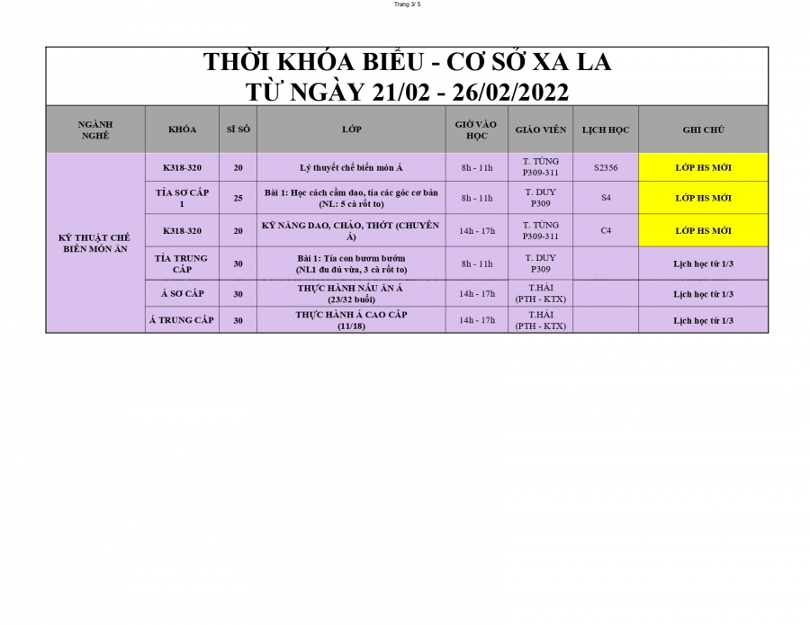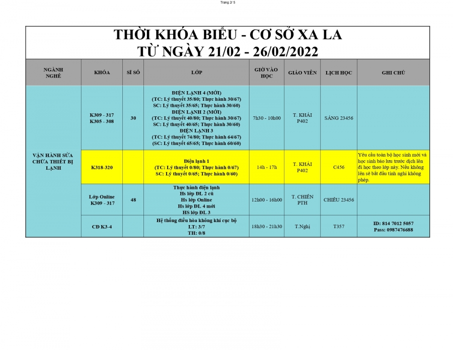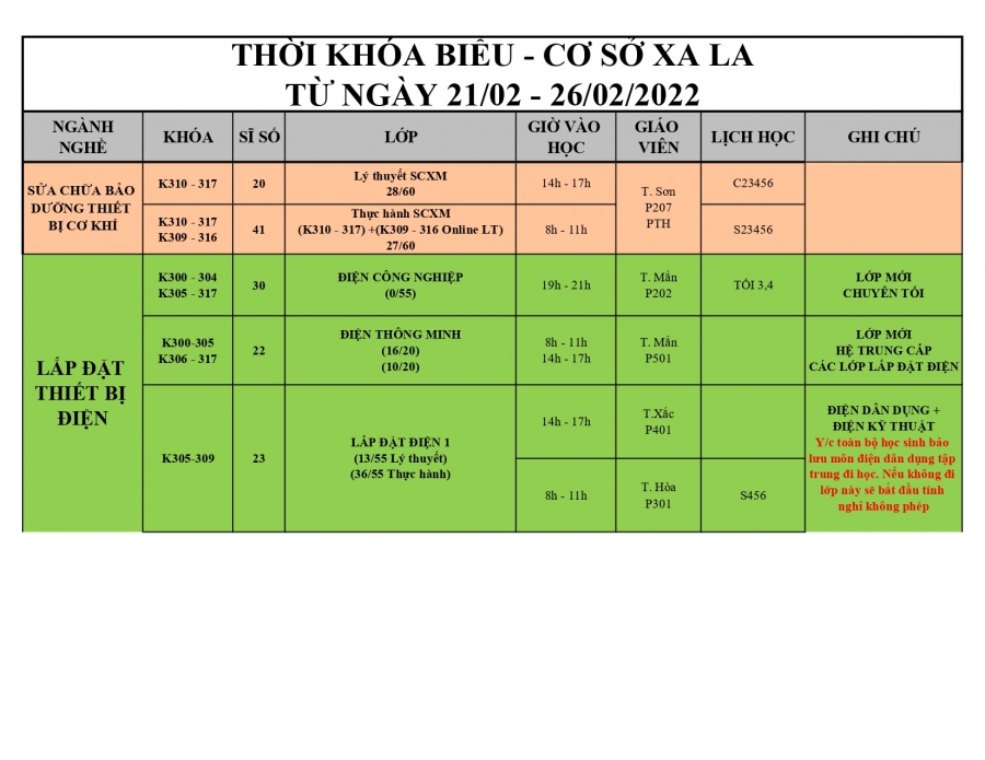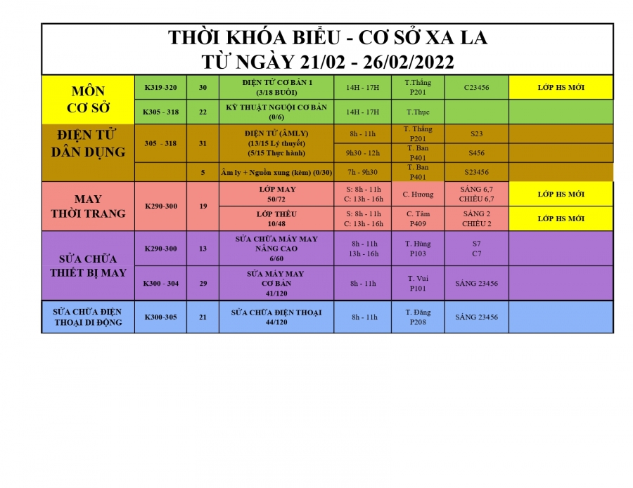 Trung tâm dạy nghề Thanh Xuân thông báo lịch học từ 21/2/2022 - 26/2/2022.