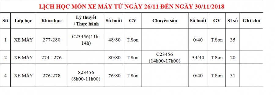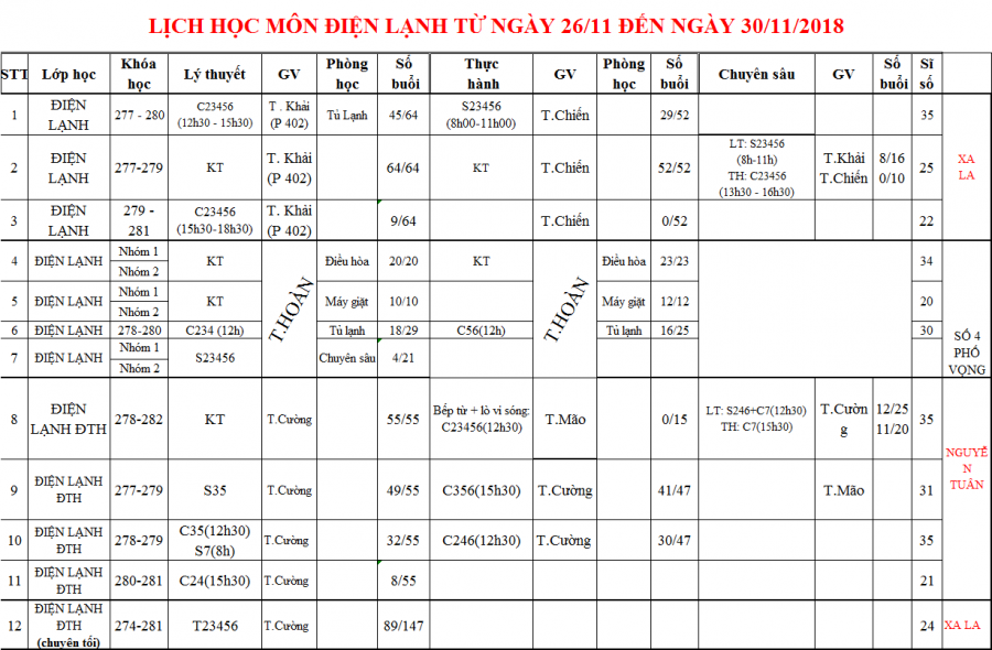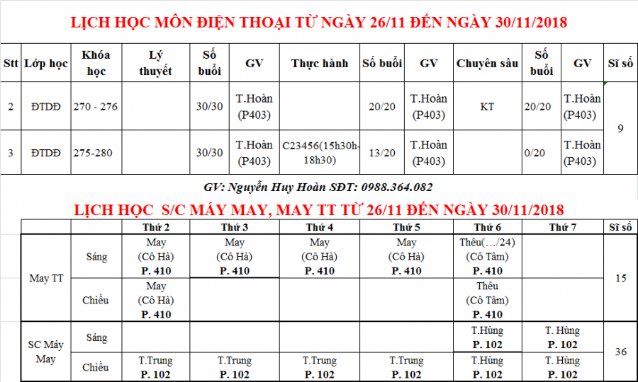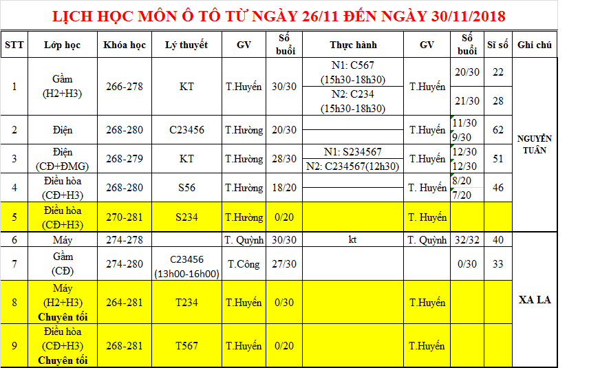 PHÒNG ĐÀO TẠO THÔNG BÁO LỊCH HỌC TỪ 26/11 ĐẾN 30/11/2018