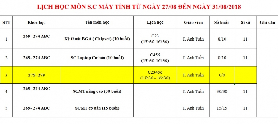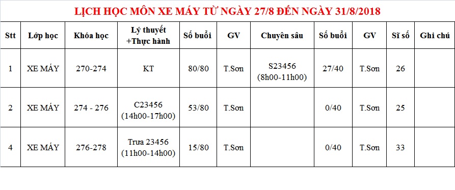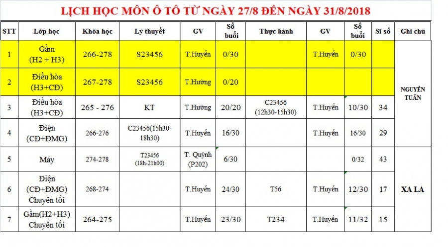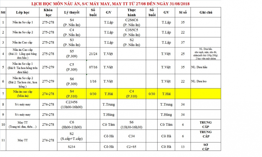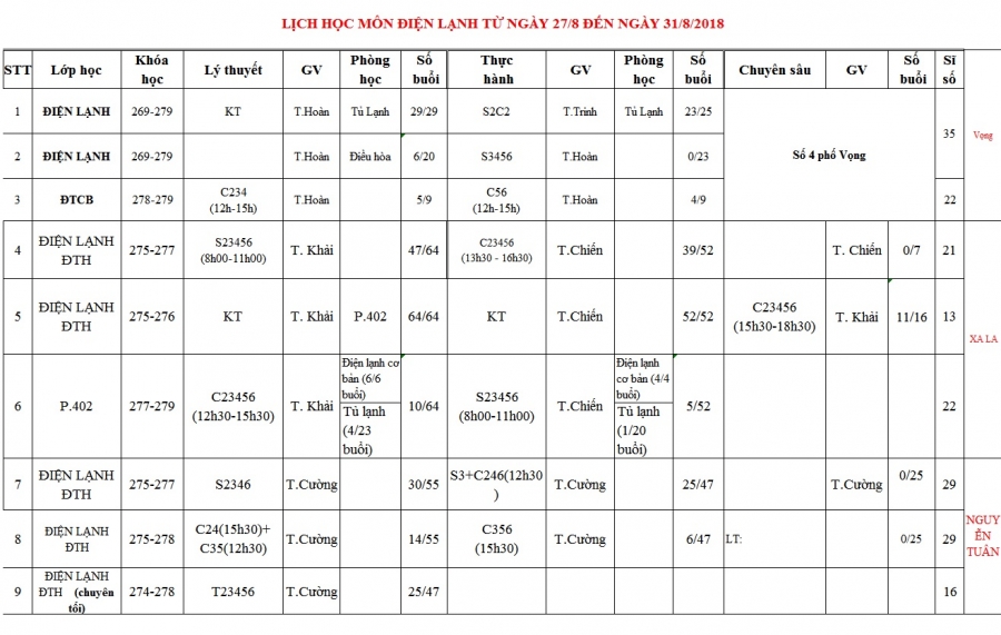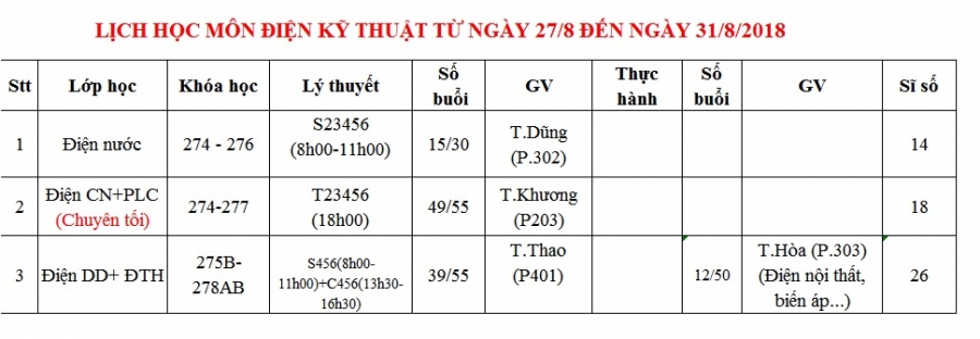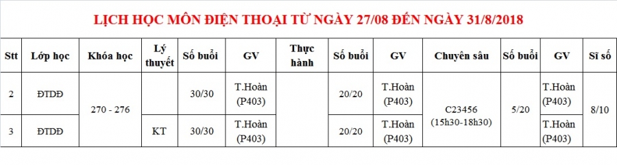 PHÒNG ĐÀO TẠO THÔNG BÁO LỊCH HỌC TỪ 27/8 ĐẾN 31/8/2018