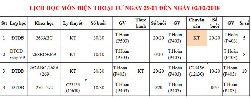THÔNG BÁO LỊCH HỌC TỪ 29/01/2018 ĐẾN 02/02/2018
