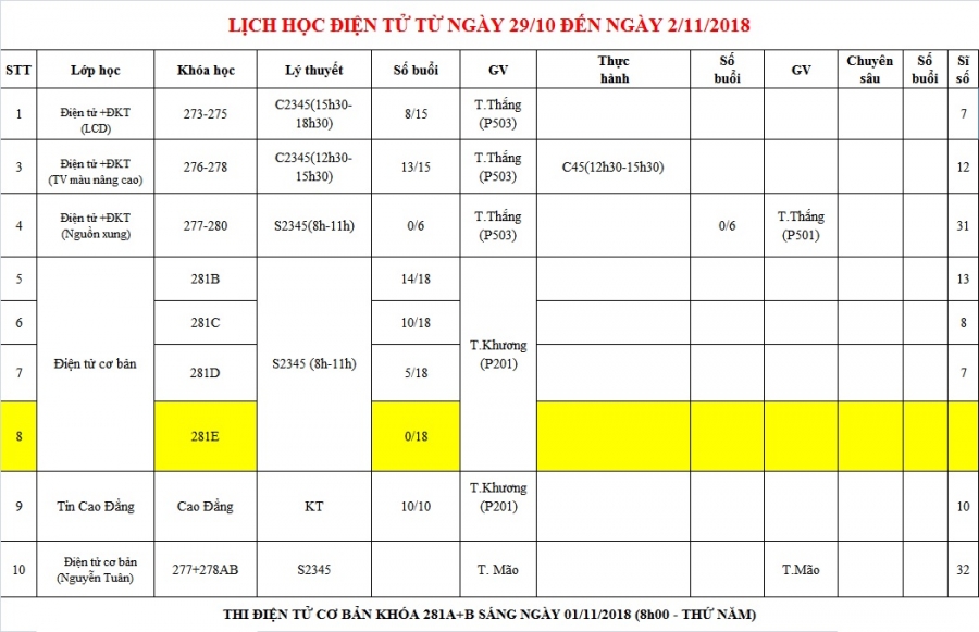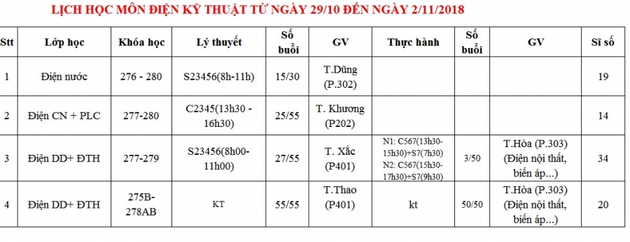 PHÒNG ĐÀO TẠO THÔNG BÁO LỊCH HỌC TỪ 29/10 ĐẾN 02/11/2018