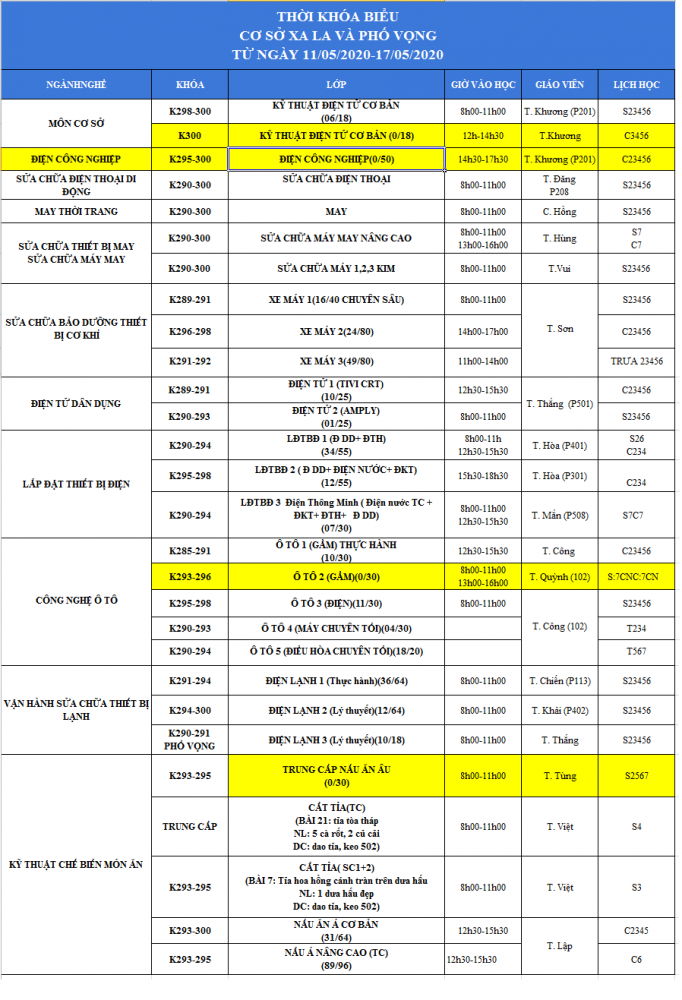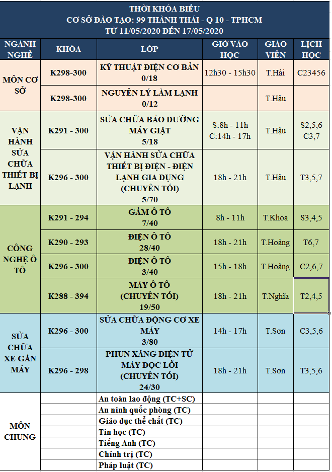 Thông Báo Lịch Học Tuần Mới Từ 11/05/2020 ĐẾN NGÀY 16/05/2020, LỚP CHUYÊN NGÀNH MỚI: Điện công nghiệp