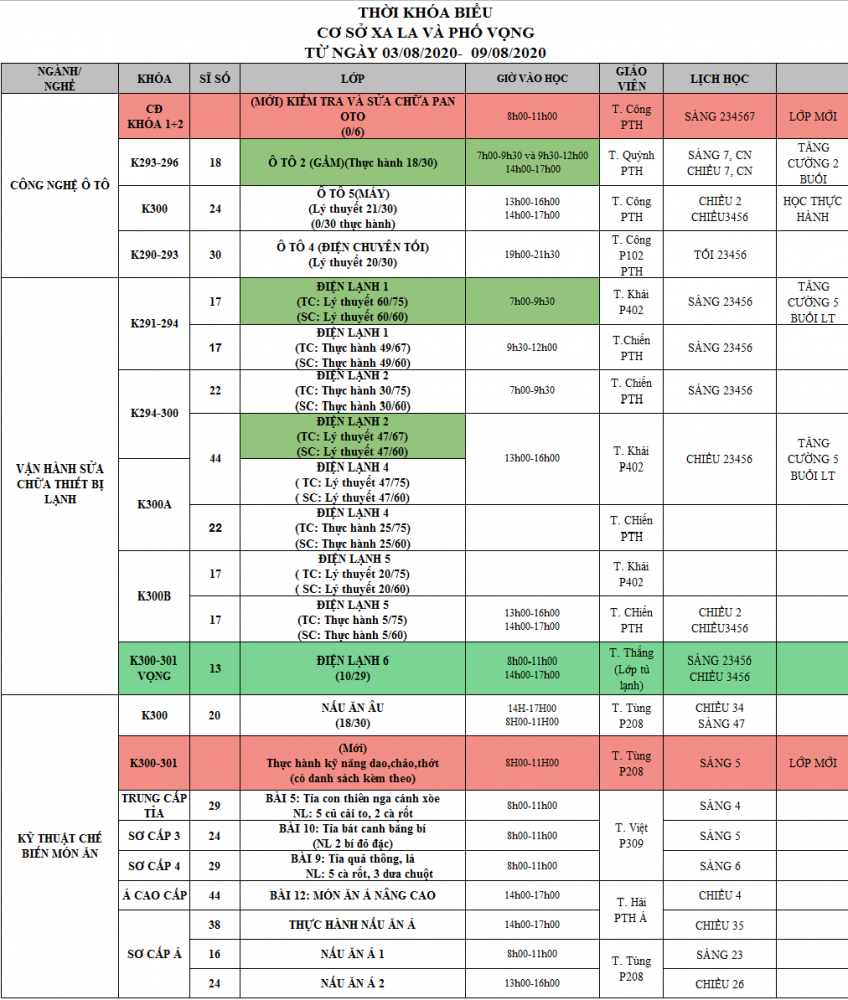 THÔNG BÁO LỊCH HỌC TUẦN 1 THÁNG 08/2020