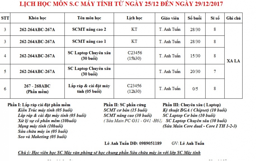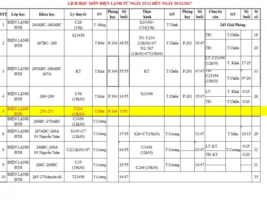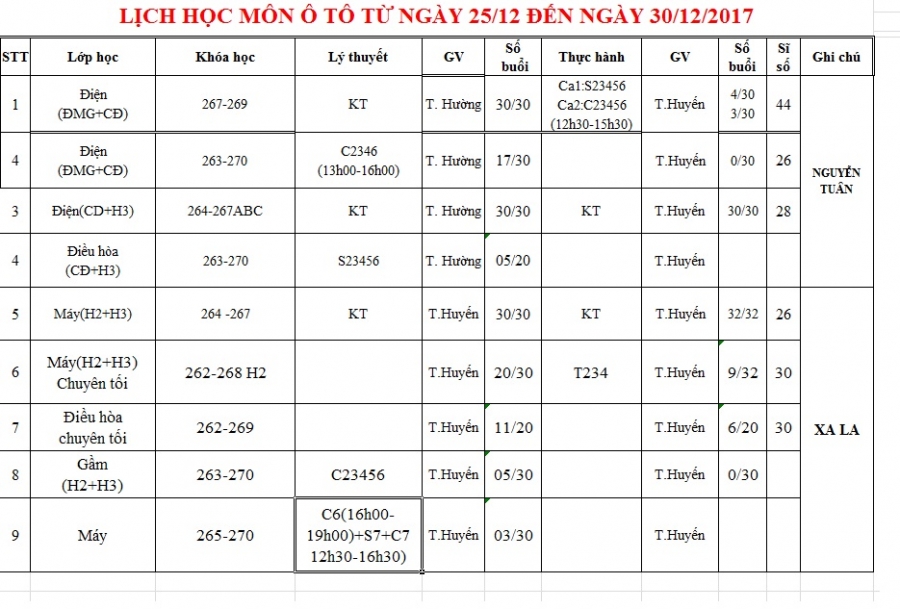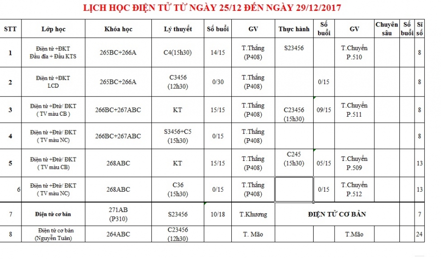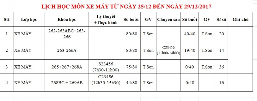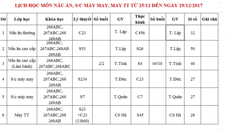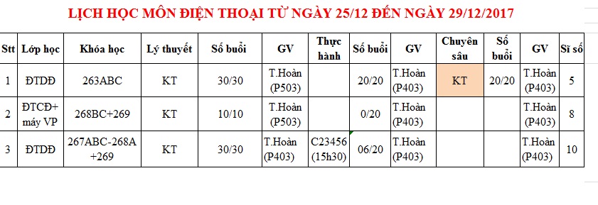Thông báo lịch học tuần 4 từ 25/12/2017 đến 29/12/2017