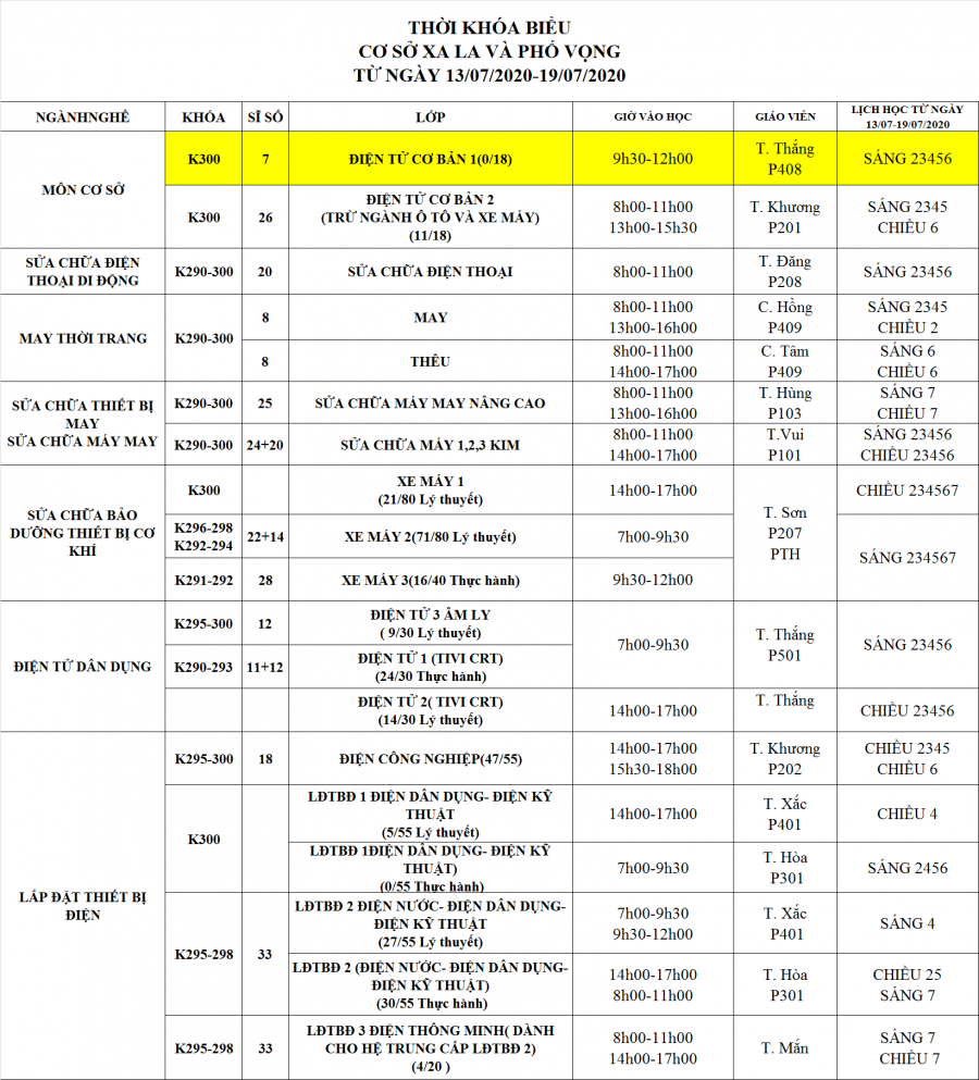 THÔNG BÁO LỊCH HỌC TUẦN MỚI TỪ 13/07- 19/07