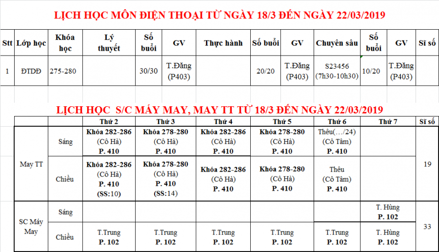 THÔNG BÁO LỊCH HỌC TUẦN MỚI TỪ 18/03 ĐẾN 23/03/2019