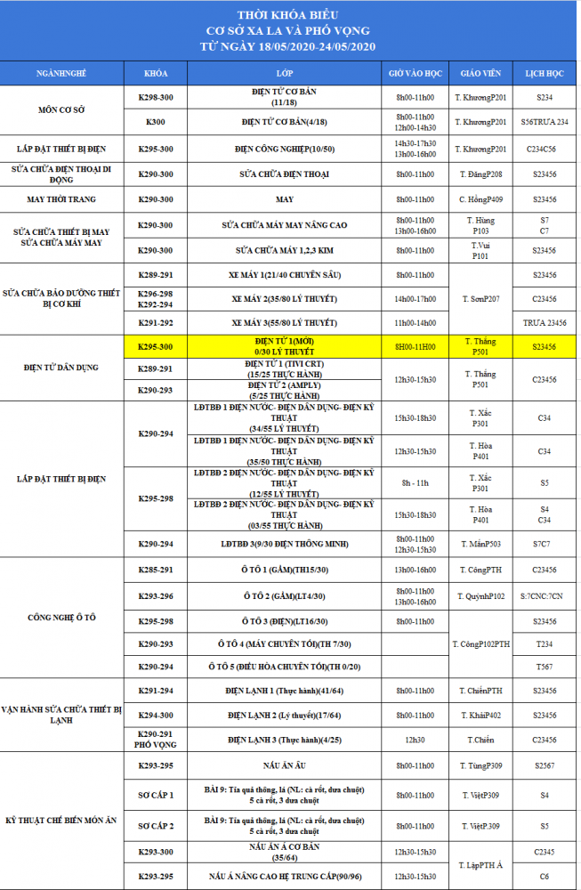 THÔNG BÁO LỊCH HỌC TUẦN MỚI TỪ 18/05 -24/05/2020, LỚP CHUYÊN NGÀNH MỚI:Điện Tử học sáng thứ 2,3,4,5,6 từ 8h-11h tại Phòng 501.các học viên đăng ký học Điện Tử- Điện Lạnh, Hoặc Điện Tử - Dân Dụng có thể vào học luôn lớp này.