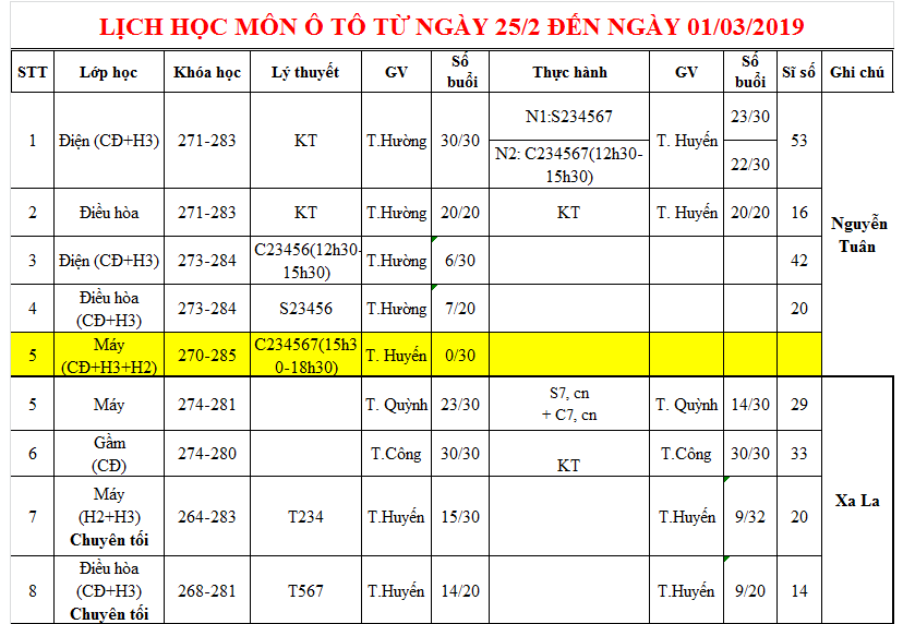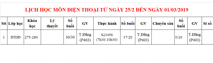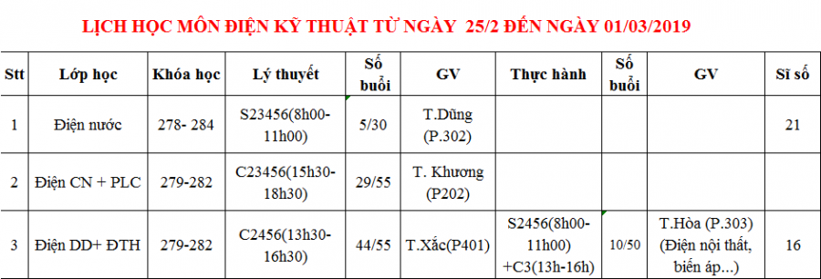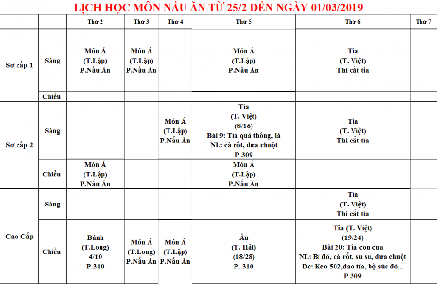 THÔNG BÁO LỊCH HỌC TUẦN MỚI TỪ 25/02 ĐẾN 01/03/2019