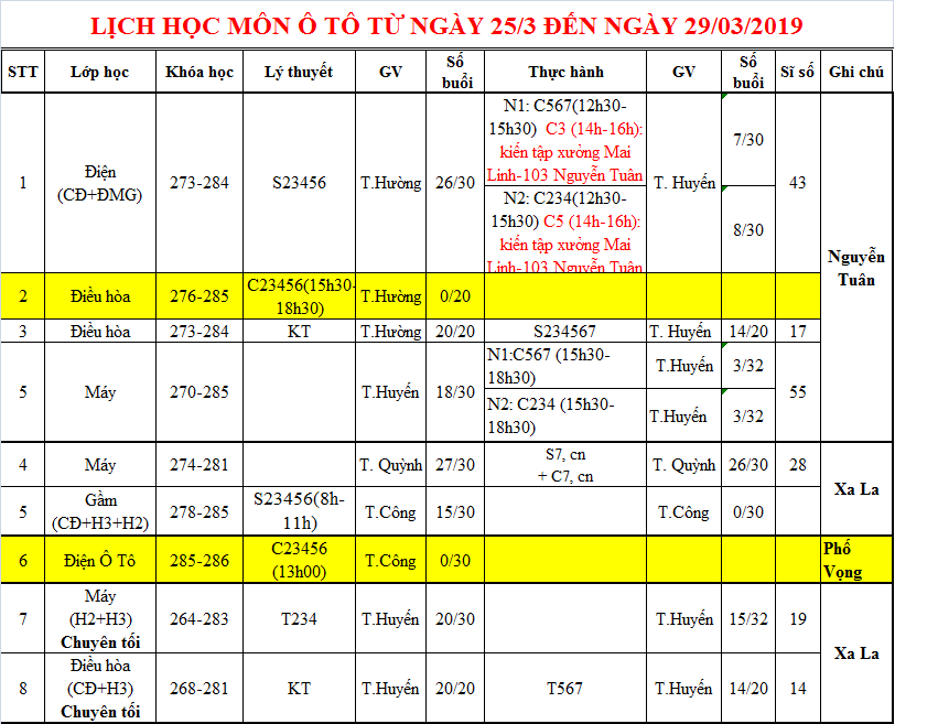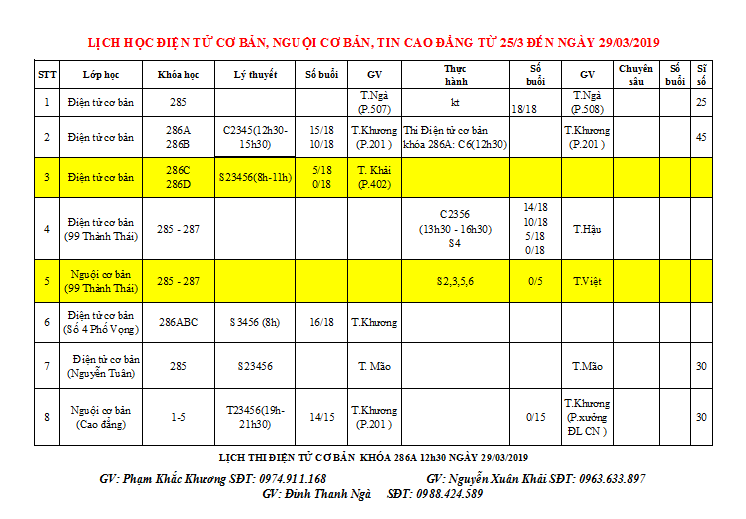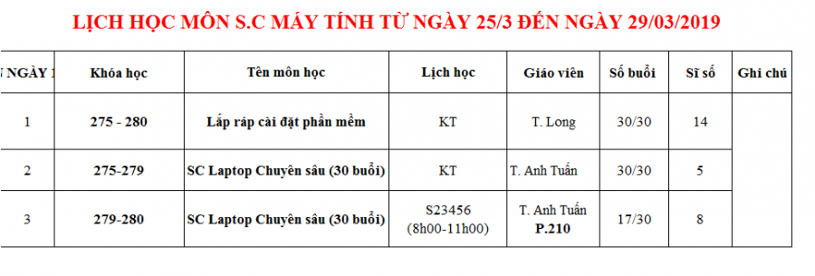 THÔNG BÁO LỊCH HỌC TUẦN MỚI TỪ 25/03 ĐẾN 29/03/2019