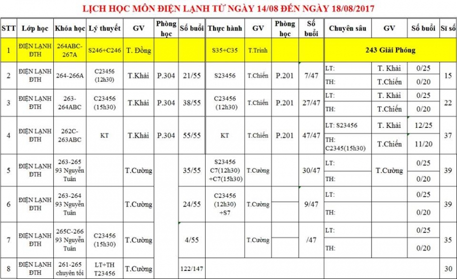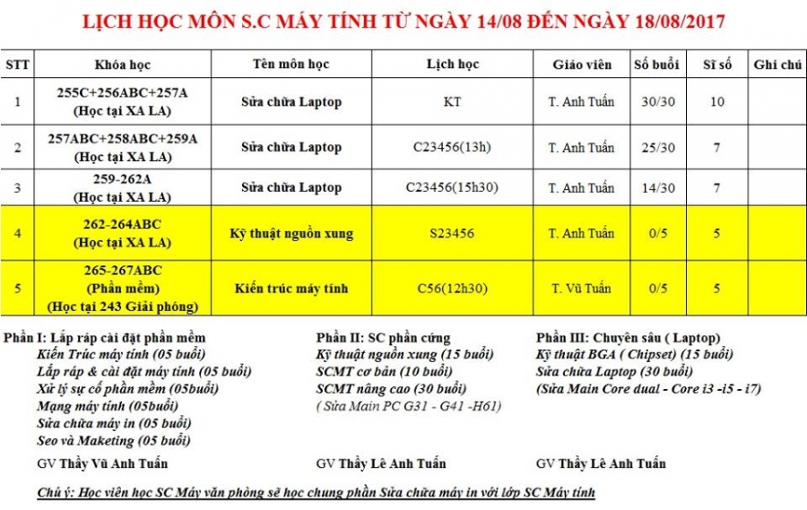 THÔNG BÁO LỊCH HỌC TUẦN TỪ NGÀY 14/08 ĐẾN 18/08/2017