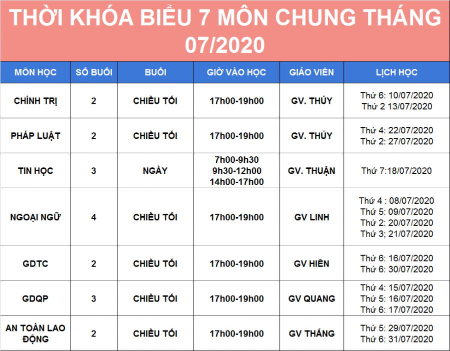THÔNG BÁO LỊCH HỌC VĂN HÓA T7/2020