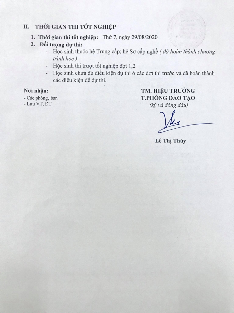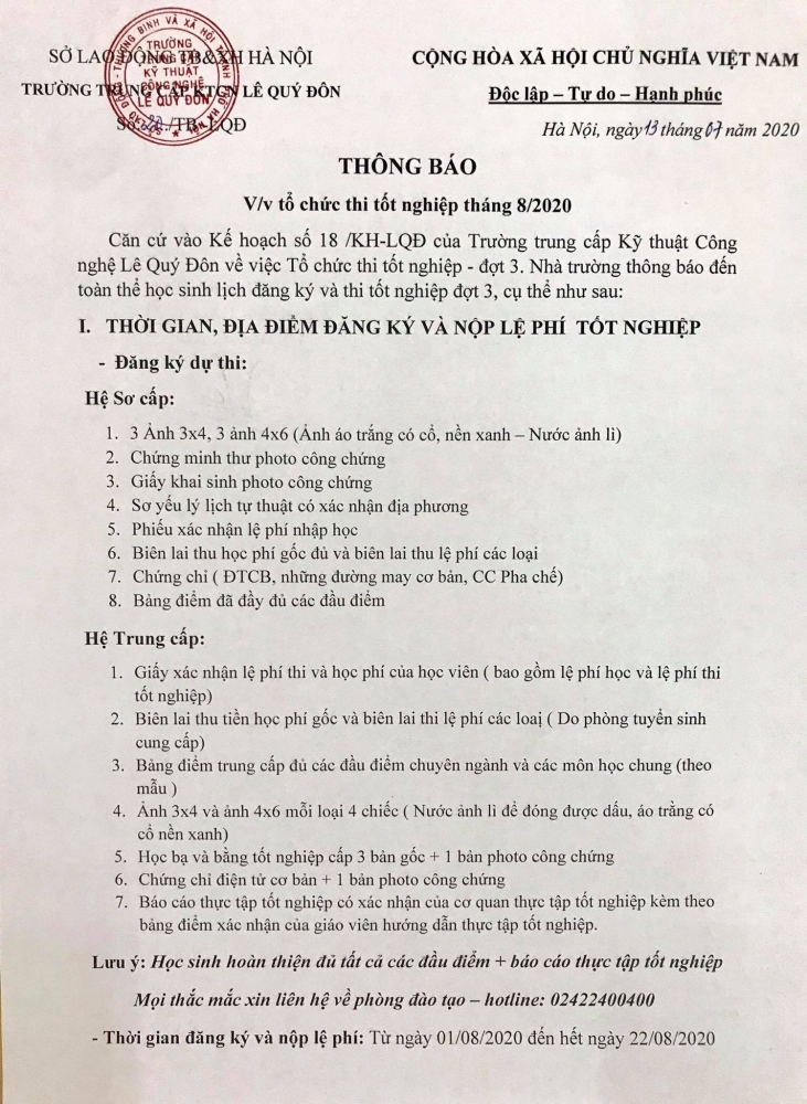 THÔNG BÁO LỊCH THI TỐT NGHIỆP THÁNG 08/2020