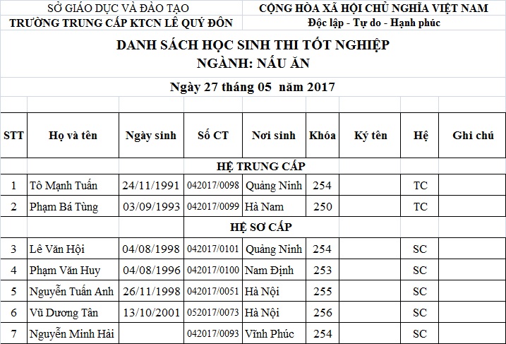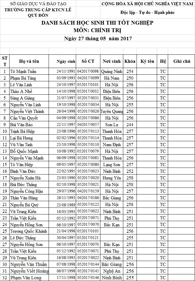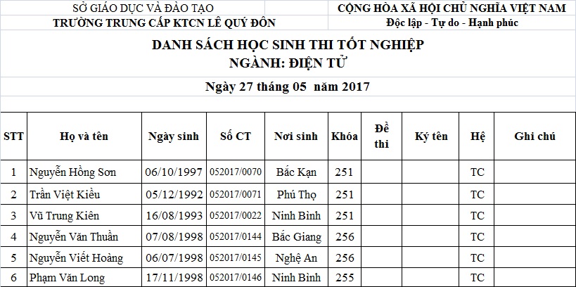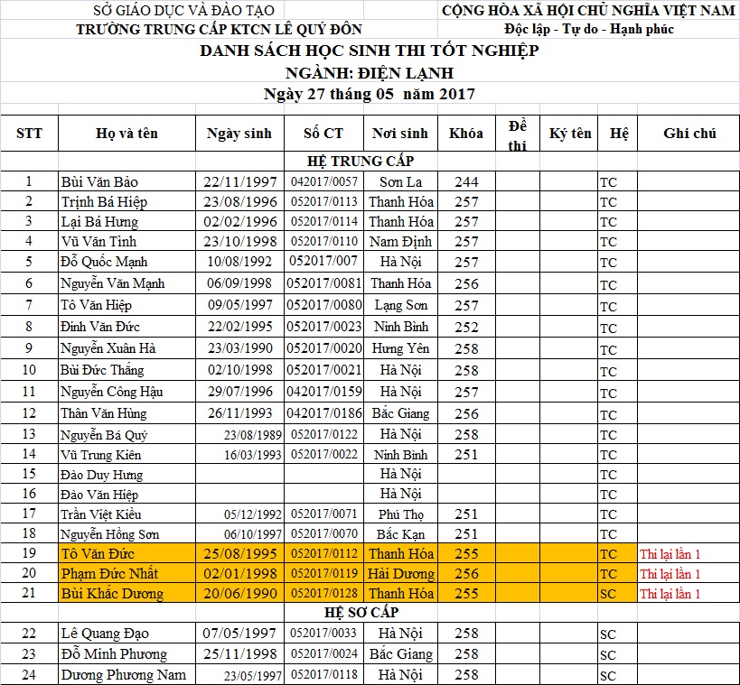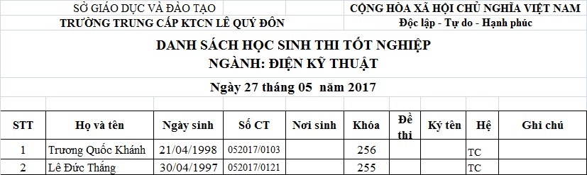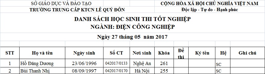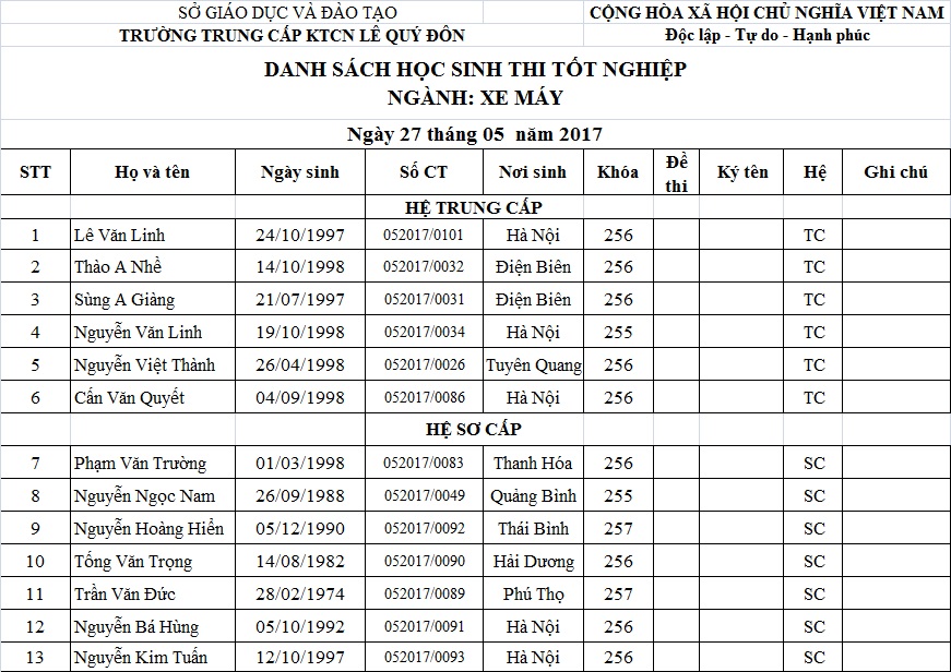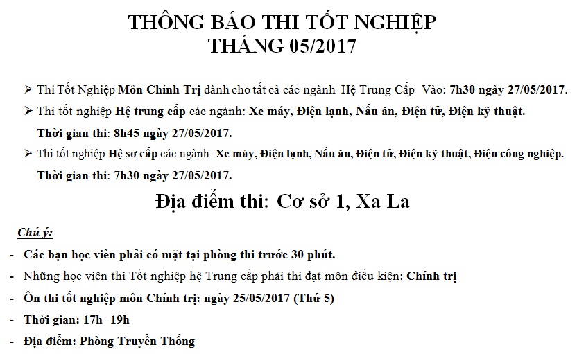 THÔNG BÁO LỊCH THI VÀ DANH SÁCH THI TỐT NGHIỆP THÁNG 05.2017