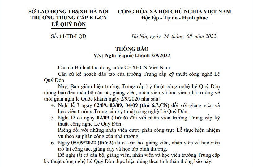 THÔNG BÁO NGHỈ LỄ QUÓC KHÁNH 2/9/2022