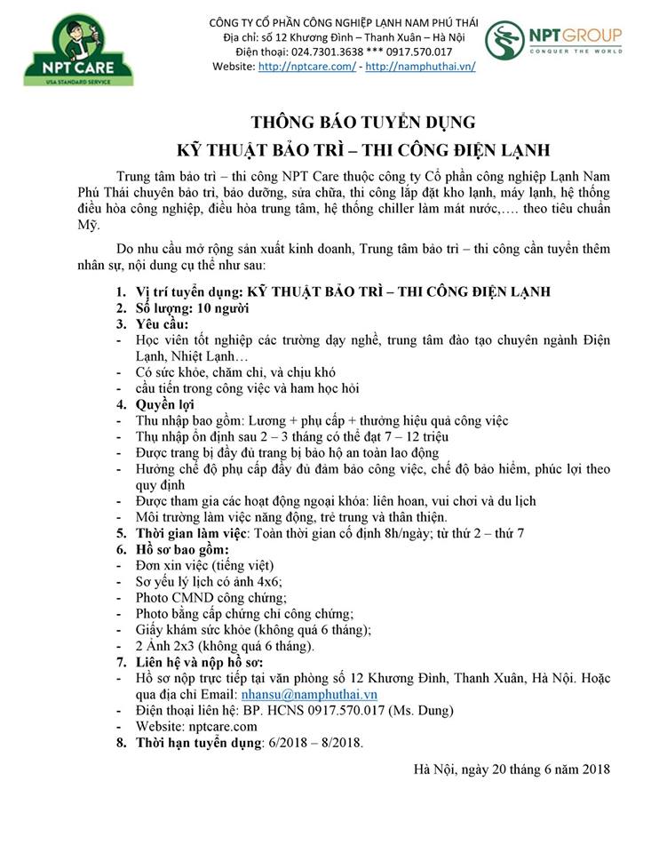 | Vị trí cần tuyển: | Kỹ thuật bảo trì – thi công Điện Lạnh |
